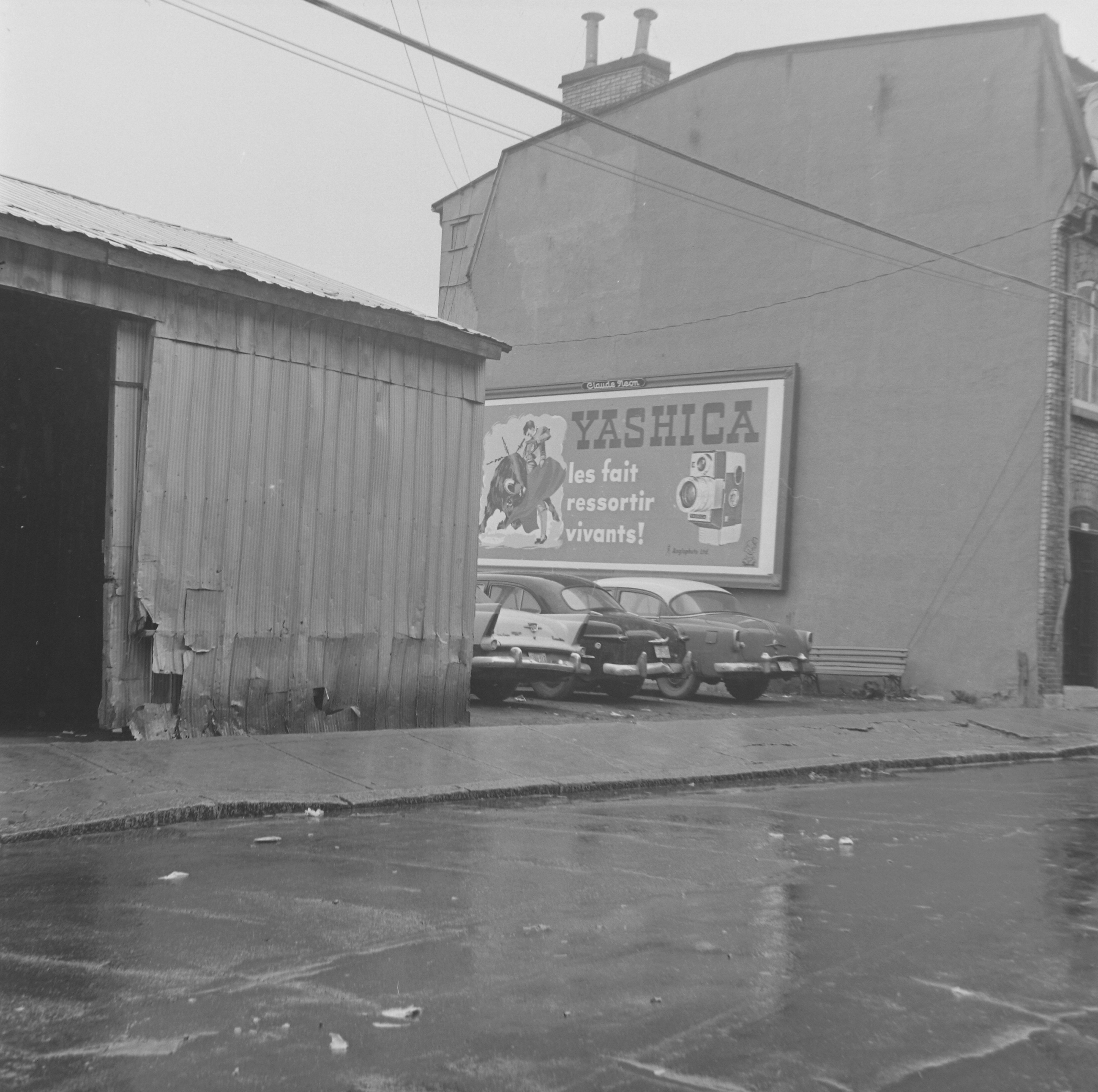 Service de police Il s'agit d'un négatif représentant un stationnement où l'on peut voir une affiche publicitaire d'une caméra de marque Yashica.