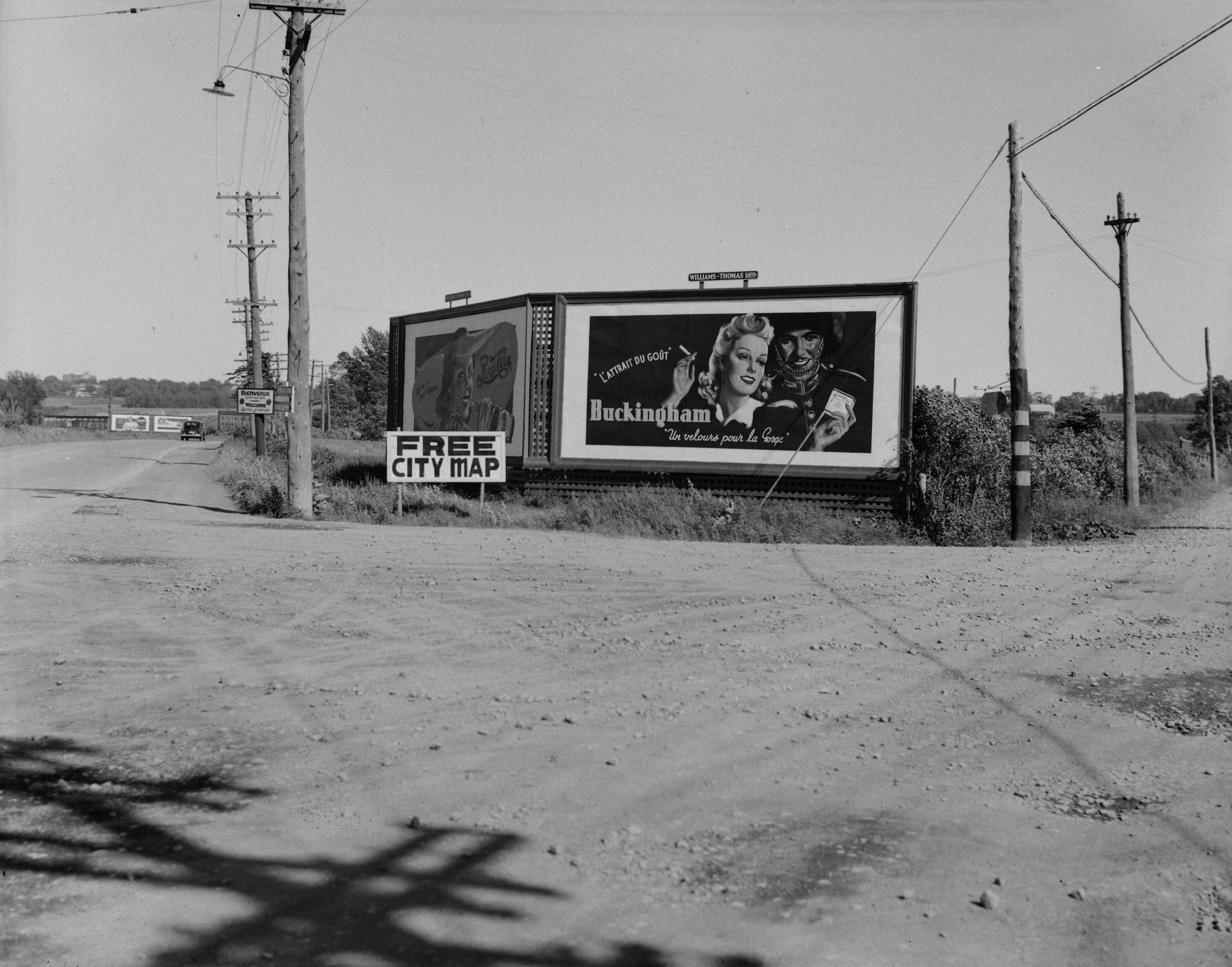 Il s'agit d'un négatif représentant des panneaux publicitaires situés à l'entrée de Québec. L'une d'entre elles annonce les cigarettes Buckingham. On y voit également une affiche sur laquelle on peut y lire : " Free City Map ".
